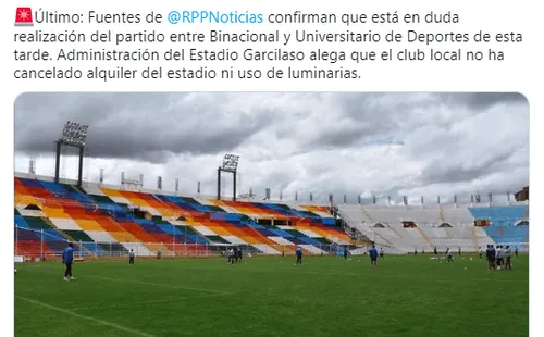 “Fuentes de RPP confirman que está en duda la realización del partido entre Binacional y Universitario de Deportes de esta tarde. La Administración del Estadio Garcilaso alega que el club local no ha cancelado alquiler del estadio ni uso de luminarias”, publicaron.