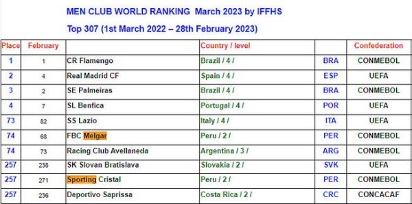 Por ende, su temporada 2022 fue inolvidable, desde todo ámbito. El que le sigue como peruano dentro del ranking es Sporting Cristal en la casilla 257. La diferencia es notoria, y podría ser hasta preocupante. Debido a que el peso de competencias internacionales es fundamental en este tipo de listados. Perú no viene bien en este apartado, nos queda pendiente. Por eso no vemos ni a Alianza Lima o Universitario de Deportes cerca, andan en demasiada deuda dentro de la materia presentada. No deben confiarse.
