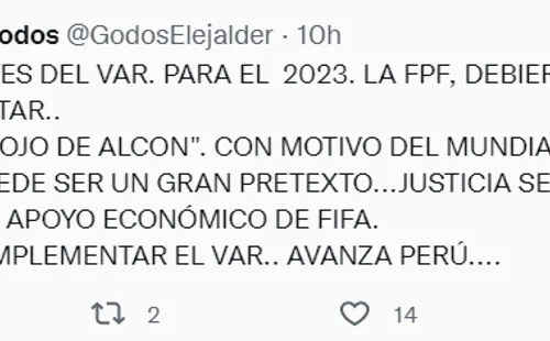 “Quizás antes del VAR, para el 2023, la FPF debiera implementar el reloj ojo de halcón. Con motivo del Mundial sub-17, puede ser un gran pretexto. Justicia señores”,escribió el comunicador en su cuenta de Twitter.