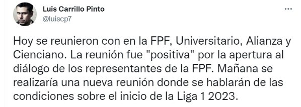 “Hoy se reunieron con en la FPF, Universitario, Alianza y Cienciano. La reunión fue “positiva” por la apertura al diálogo de los representantes de la FPF. Mañana se realizaría una nueva reunión donde se hablarán de las condiciones sobre el inicio de la Liga 1 2023“, comentó el hombre de prensa en su cuenta de Twitter.