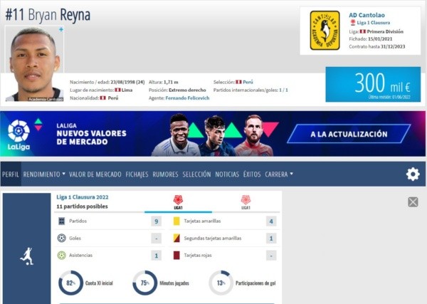 Ahora, basándonos en su edad, el talento y que ya debutó con la Selección Peruana, con gol incluido, Bryan Reyna todavía no tiene un nuevo valor económico en Transfermarkt, pero su último reporte es auspicioso, económicamente hablando.