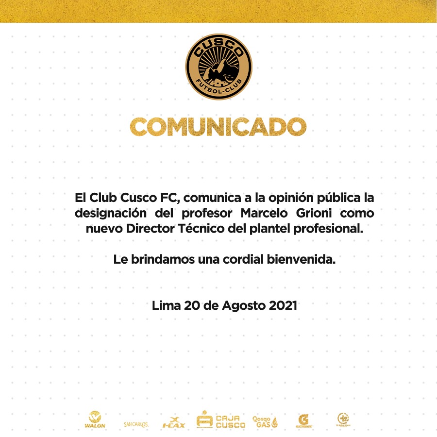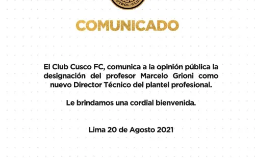 El club con un comunicado en sus redes sociales hizo pública la contratación del técnico: “El Club Cusco FC, comunica a la opinión pública la designación del profesor Marcelo Grioni como nuevo director técnico del plantel profesional. Le brindamos una cordial bienvenida”, agregó la institución cusqueña con la llegada de su nuevo estratega.