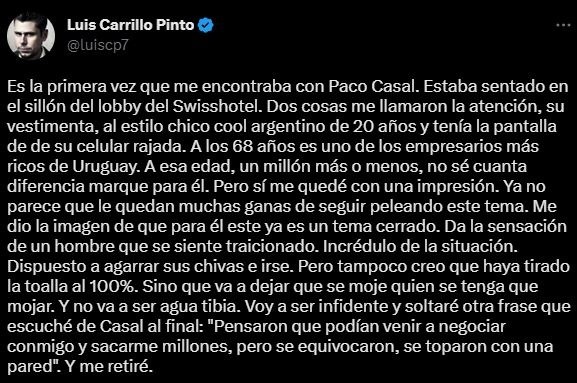 La cual encontró al final de todo, y sorprende cómo es que se maneja el mencionado mandamás de GolPeru: “Es la primera vez que me encontraba con Paco Casal. Estaba sentado en el sillón del lobby del Swisshotel. Dos cosas me llamaron la atención, su vestimenta, al estilo chico cool argentino de 20 años y tenía la pantalla de su celular rajada. A los 68 años es uno de los empresarios más ricos de Uruguay. A esa edad, un millón más o menos, no sé cuánta diferencia marque para él. Pero sí me quedé con una impresión. Ya no parece que le quedan muchas ganas de seguir peleando este tema. Me dio la imagen de que para él este ya es un tema cerrado. Da la sensación de un hombre que se siente traicionado. Incrédulo de la situación. Dispuesto a agarrar sus chivas e irse. Pero tampoco creo que haya tirado la toalla al 100%”.
