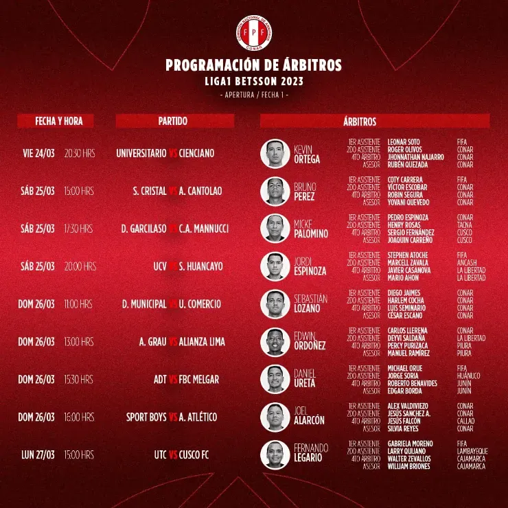 Por su parte, en el duelo entre piuranos e íntimos, tendrán como parte a los referees: Carlos Llerena y Deyvi Saldaña, quienes estarán desde las 13:00 hrs (hora peruana), este domingo 26 de marzo.
