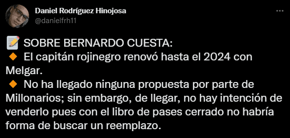“No ha llegado ninguna propuesta por parte de Millonarios; sin embargo, de llegar, no hay intención de venderlo, pues con el libro de pases cerrado no habría forma de buscar un reemplazo”. Enhorabuena por estas decisiones tomadas con anticipación, siempre adelantándose a la jugada Melgar, por eso les va tan bien ahora mismo.