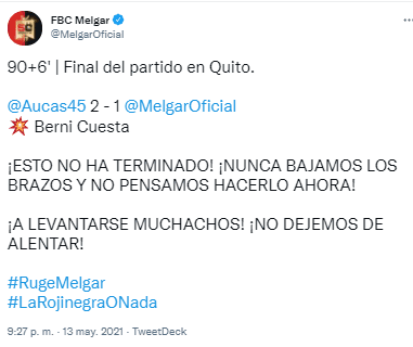 Ahora FBC Melgar deberá esperar el duelo de visitante contra Athlético Paranaense el próximo miércoles 19 a las 7:30 PM – HORA PERUANA. Y después tendrá que recibir el jueves 27 a Metropolitanos. Para así ver si puede pasar a la siguiente fase. Solo 1 equipo pasa por grupo.