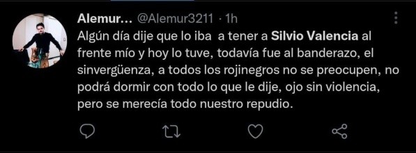 “Algún día dije que lo iba a tener a Silvio Valencia al frente mío y hoy lo tuve, todavía fue al banderazo, el sinvergüenza, a todos los rojinegros no se preocupen, no podrá dormir con todo lo que le dije, ojo sin violencia, pero se merecía todo nuestro repudio”. Fue lo que colocó su red personal, y automáticamente despertó el interés de todos.