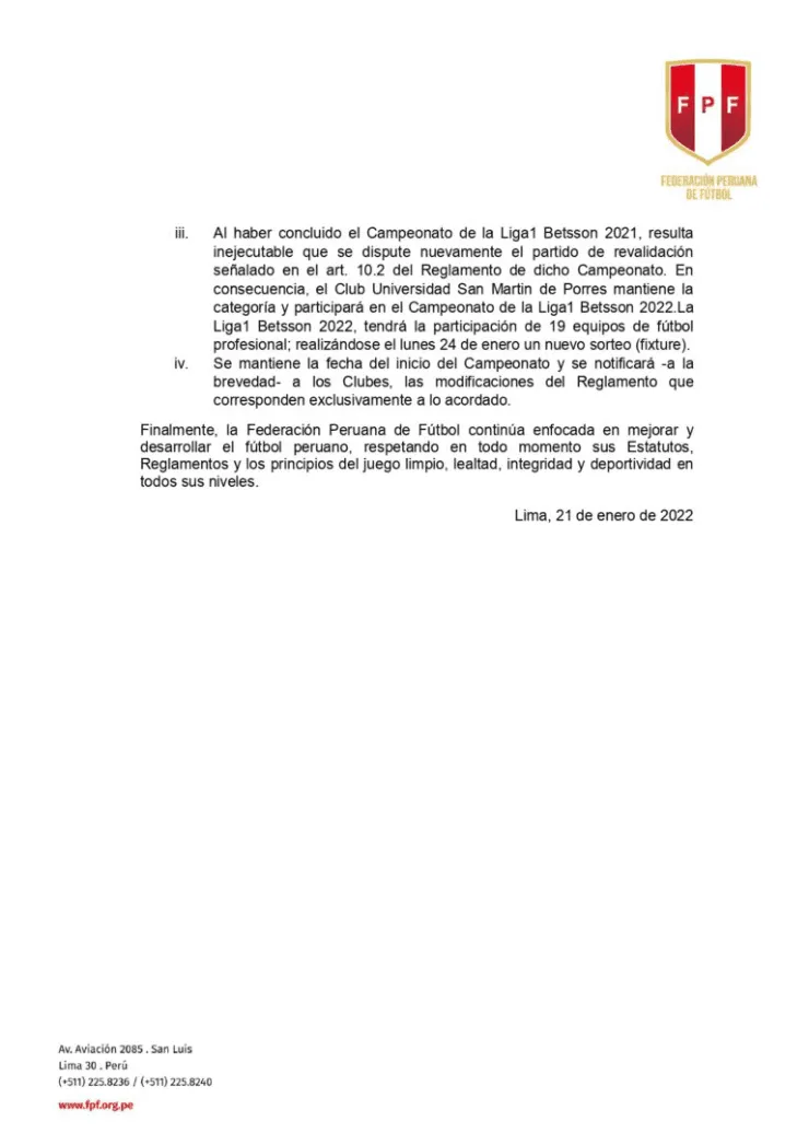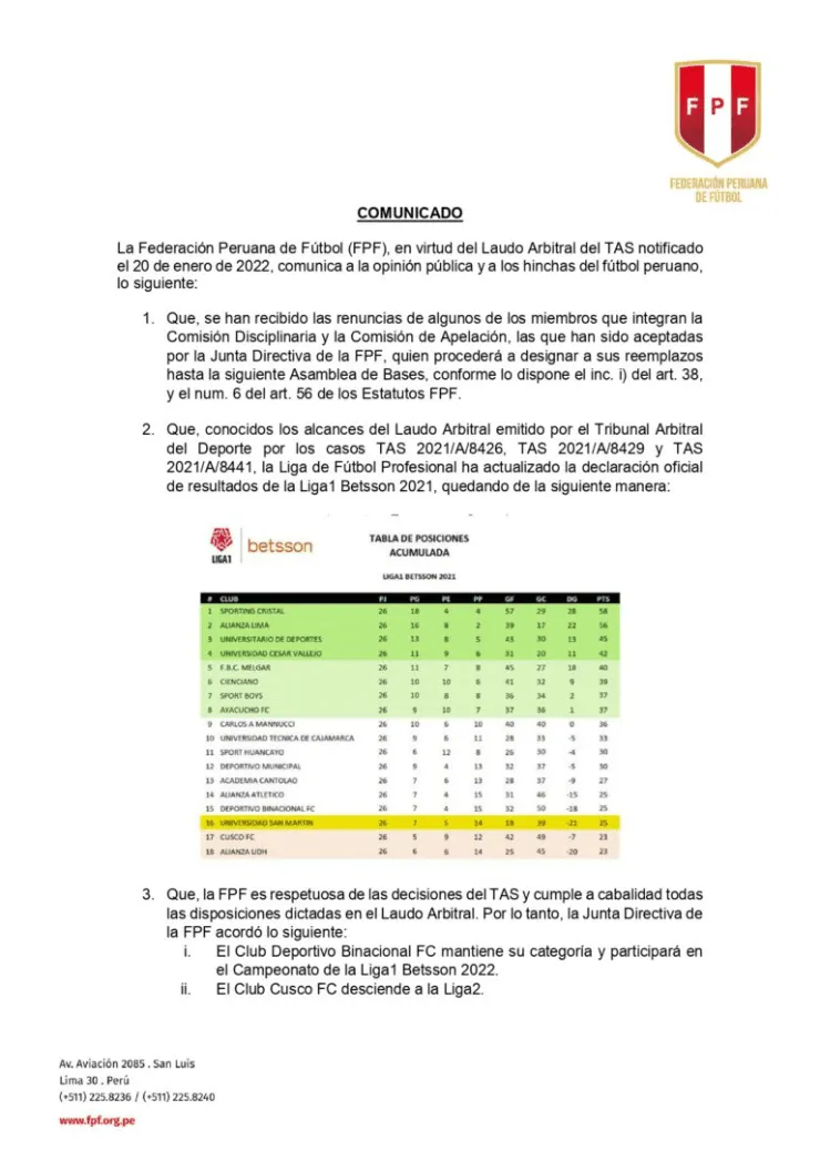 El documento explica que luego del Laudo Arbitral, Binacional permanecerá en la Liga 1, mientras queSan Martín al haber concluido el campeonato 2021 no puede disputar un partido de revalidación ante Carlos Stein (que también jugará el torneo) y se ganó su derecho de volver a Primera División. Es por ello que el único club que se va a la Liga 2 es Cusco FC, que se había reforzado con jugadores importantes y ahora se verá obligado a replantear su temporada 2022.