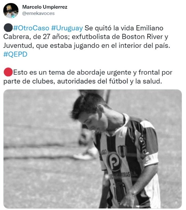 El volante de Carlos A. Mannucci declaró frente a cámaras la pérdida de un amigo futbolista en Uruguay: “Anoche se suicidó otro futbolista en Uruguay, un amigo de Boston River, Emiliano, un chico de 27 años y este año ya son tres. Tenemos que hablar, vivimos en una sociedad machista y al hombre le da vergüenza hablar de depresión. Yo sufrí de depresión en México, pedí ayuda y pude salir adelante. Le pido a todos que hablen del tema, es importantísimo, ya perdimos mucha gente querida y la verdad que no la pasé nada bien”, dijo ‘Felucho’ Rodríguez.