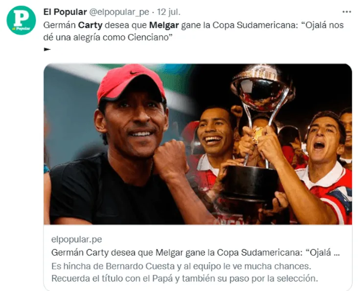 “Están haciendo bien las cosas, están fuertes en lo mental y en lo futbolístico. Espero que sigan avanzando y nos den una alegría como lo hicimos nosotros con Cienciano el 2003”, dijoCarty, cuando le preguntaron sobre las chances del ‘dominó’ en los cuartos de final de la Conmebol Sudamericana.