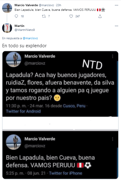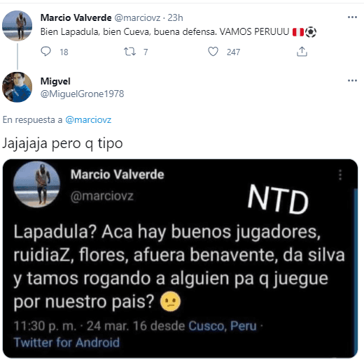 Marcio Valverde en su cuenta de Twitter puso lo siguiente: “Bien Lapadula, bien Cueva, buena defensa. VAMOS PERÚ”. Generando una interacción importante con sus seguidores, hasta que aparecieron un par con capturas del mismo jugador en épocas pasadas.