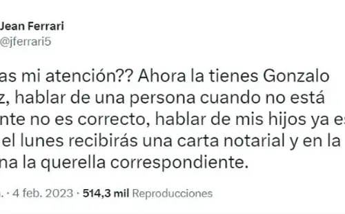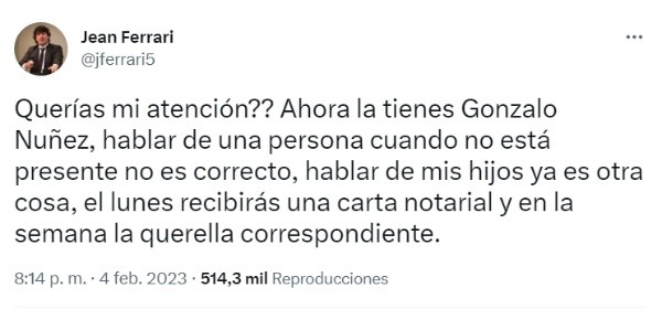 “Es humano equivocarse y es de hombres rectificarse. Me equivoqué, tuve palabras fuertes, duras y desafortunadas contra Jean Ferrari. Quiero pedirle disculpas a Jean Ferrari, tuve palabras duras contra él e involucre a sus hijos”, comentó en un primer momento Gonzalo Núñez en A Presión.