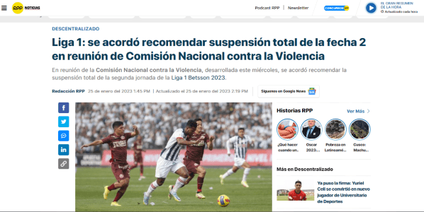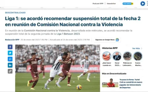 En su página web, RPP Noticias, comunicó lo siguiente: “En reunión de la Comisión Nacional contra la Violencia, que se desarrolló este miércoles, RPP Noticias pudo conocer que se acordó recomendar la suspensión total de la fecha 2 del Torneo Apertura de la Liga 1 Betsson 2023, la cual estaba programada para este fin de semana”.