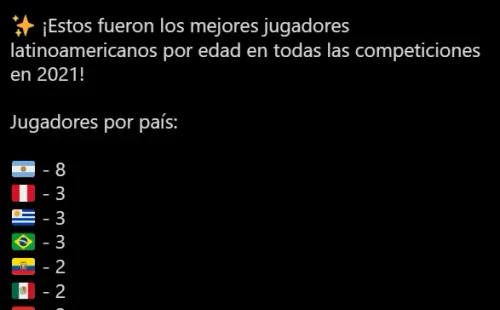 “¡Estos fueron los mejores jugadores latinoamericanos por edad en todas las competiciones en 2021! Jugadores por país: 8 Uruguay, 3 Brasil, 2 Ecuador, 2, México 2, Paraguay 2, y Chile 1”. Pero hay un detalle que a nosotros nos interesa más, porque se trata de nuestro ambiente local.