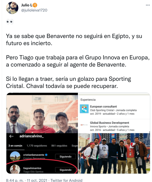 Y es que Tiago Santos, de Innova, o sea Cristal,comenzó a seguir a Adrian Calvino, representante del Chaval, que hoy por hoy no tiene equipo y no será considerado en Egipto, donde tiene contrato. Ya se verá si se termina concretando ¡A esperar!
