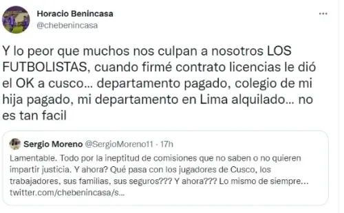 Este escándalo ha causado gran revuelo en todos, periodistas, hinchas, y claro está, jugadores. Quien hizo su descargo, de manera eufórica, en las redes sociales fue el defensor Horacio Benincasa, quien mediante su Twitter publicó: “Por segundo año consecutivo, se cagan en todos y se llevan familias por delante. Justos pagan por pecadores dicen no?”, comentóel futbolista.