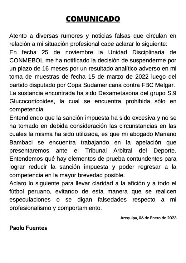 No son buenas noticias para el ambiente fútbol en el Perú. Recientemente vía redes sociales, un jugador de la Liga 1 ha comunicado que ha dado positivo por doping y que CONMEBOL lo ha suspendido por 16 meses. Comentando que ha sido por la sustanciaDexametasona, el futbolista informó que apelará la sanción ante el TAS.