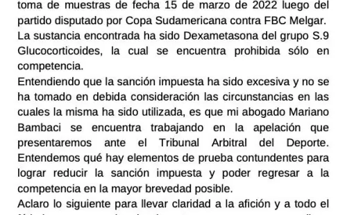 Publicando un amplio comunicado a la opinión pública, el futbolista acepta su responsabilidad, pero también aduce que la sanción le resulta desmedida y que irá a instancias internacionales para apelar el fallo de la CONMEBOL.