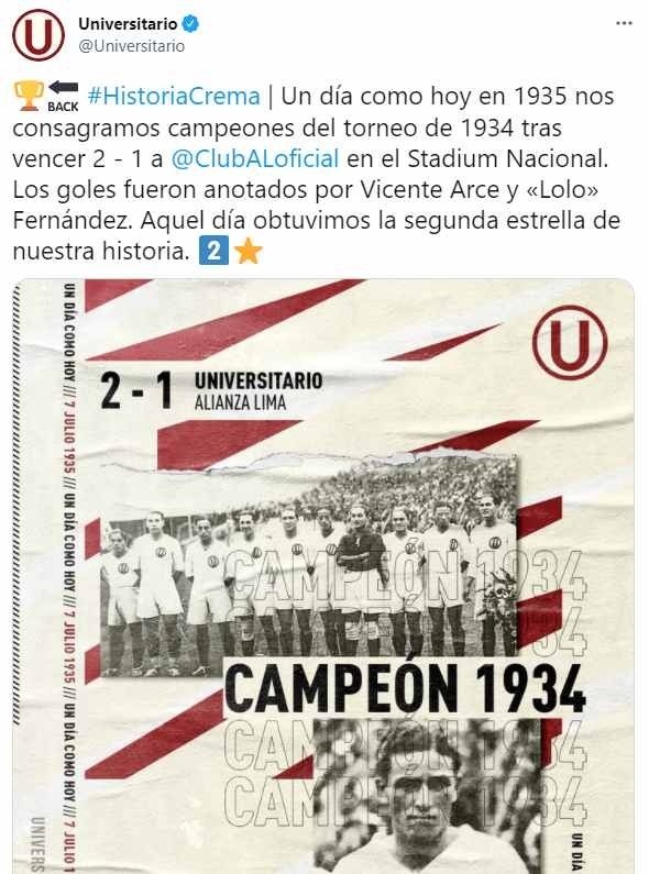 “En día como hoy en 1935 nos consagramos campeones del torneo de 1934 tras vencer 2 – 1 a Alianza Limaen el Stadium Nacional. Los goles fueron anotados por Vicente Arce y «Lolo» Fernández. Aquel día obtuvimos la segunda estrella de nuestra historia”, escribieron. Obviamente, tras esto, los de Alianza pegaron el grito en el cielo.