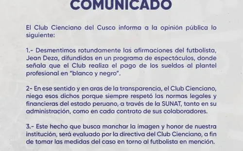 “Desmentimos rotundamente las afirmaciones del futbolista Jean Deza, difundidas en un programa de espectáculos, donde señala que el Club realiza el pago de sueldos al plantel profesional en “blanco y negro”, se lee en el comunicado.