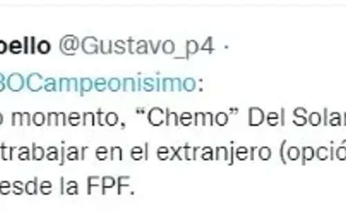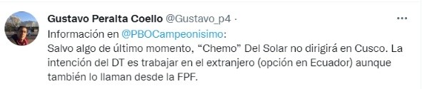 ““Chemo del Solar no va a ir ni a Cusco ni a Cienciano. Él quiere dirigir en el extranjero y tiene una opción en Ecuador. Además, también está lo de la Federación Peruana de Fútbol“, indicó en un primer momento Gustavo Peralta.