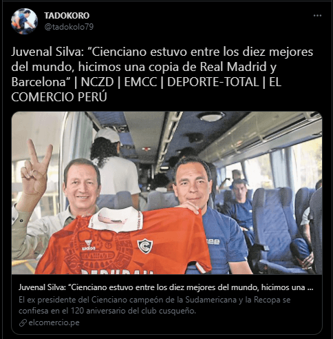 “Primero deseo saludar a quienes campeonaron desde la Copa Perú en 1972. Había jugadores que tuvieron gran renombre. Siempre estarán en el recuerdo del Cienciano del Cusco. Después, tuve la satisfacción de poder lograr la Copa Sudamericana y Recopa. Estuvimos entre los diez mejores clubes del mundo, el presupuesto de todo Cienciano era de un jugador de Boca Juniors. Tuvimos jugadores de mucha talla”.