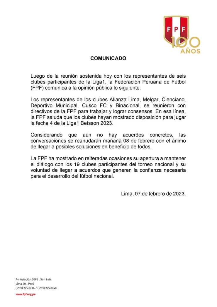 También el ente máximo del fútbol peruano, recalcó que todavía no han llegado a un acuerdo concreto y que las conversaciones se reanudarán mañana miércoles, 8 de febrero. Con el fin de llegar a posibles soluciones.