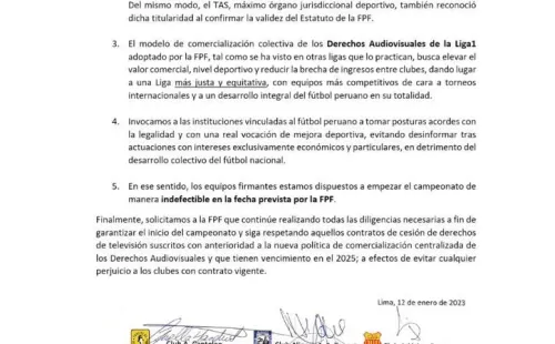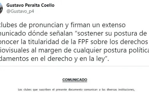 “12 clubes se pronuncian y firman un extenso comunicado dónde señalan “sostener su postura de reconocer la titularidad de la FPF sobre los derechos audiovisualesal margen de cualquier postura política y fundamentos en el derecho y en la ley”, publicó el comunicador.