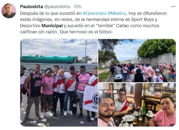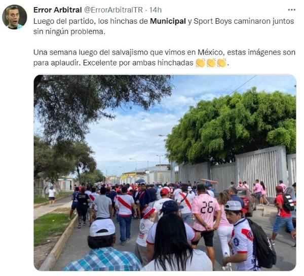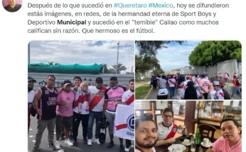 La publicación en Twitter decía lo siguiente: “Para los que “se asusten” del Callao, hoy los hinchas del Boys y Municipal caminaron juntos luego del partido, recibiendo la felicitación de la gente rosada por la victoria. ¡Echa Muni / Vamos Boys!”, se lee en la red social del usuario. Esta imagen deja ver que el fútbol no solo se juega en el campo, sino también con los hinchas, dentro y fuera de un estadio.