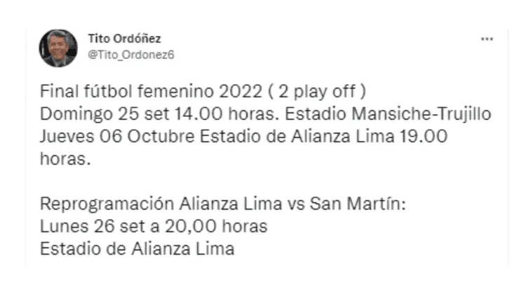 En ese contexto,Héctor Ordóñez, delegado del club‘blanquiazul’, confirmó la información mediante su cuenta de Twitter. Cabe resaltar que la razón gira a la proximidad de las elecciones municipales y al ser una semana trascendental y con posibles manifestaciones y protestas, se dotará a la ciudad de una mayor cantidad de policías desde el 28 de setiembre.