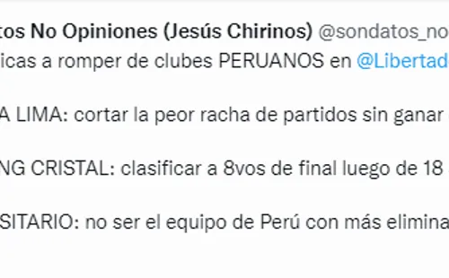 Claramente, la U no es favorita al choque y lamentablemente la historia reciente argumenta eso. Nada mejor que repasar los números que publicó en su cuenta de Twitter el periodista Jesús Chirinos enSon Datos No Opinionesrespecto a las rachas que deben romper los clubes peruanos en el máximo torneo del continente.