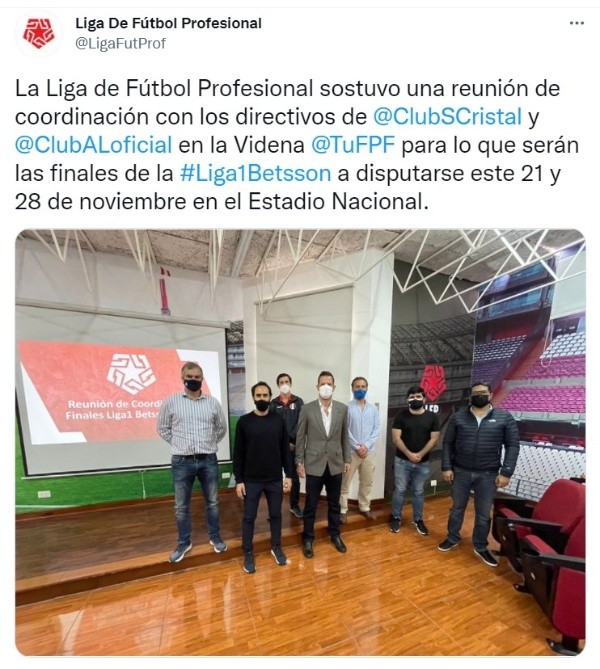 “La Liga de Fútbol Profesional sostuvo una reunión de coordinación con los directivos de Cristal y Alianza Lima en la Videna de la FPF para lo que serán las finales de la Liga1 a disputarse este 21 y 28 de noviembre en el Estadio Nacional“, esta fue la publicación que realizó la cuenta oficial del torneo en su cuenta de Twitter.