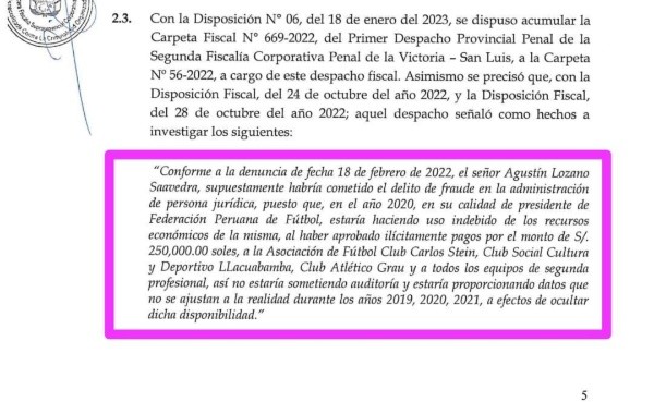 Agustín Lozano, en su calidad de presidente de la Federación Peruana de Fútbol, estaría haciendo uso indebido de los recursos económicos de la misma, al haber aprobado ilícitamente pagos por el monto de S/. 250,000.00 soles, a la Asociación de Fútbol Club Carlos Stein, Club Social Cultura y Deportivo Llacuabamba, Club Atlético Grau y a todos los equipos de segunda profesional, así no estaría sometiendo auditoría y estaría proporcionando datos que no es ajustan a la realidad durante los años 2019, 2020, 2021, a efectos de ocultar dicha disponibilidad.