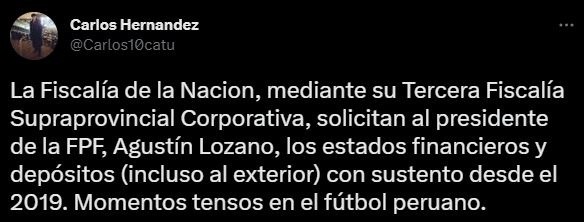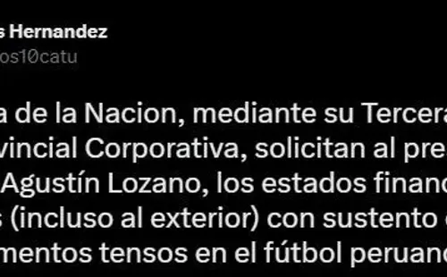 “La Fiscalía de la Nación, mediante su Tercera Fiscalía Supraprovincial Corporativa, solicitan al presidente de la FPF, Agustín Lozano, los estados financieros y depósitos (incluso al exterior) con sustento desde el 2019. Momentos tensos en el fútbol peruano”, precisó el comunicador social, y acá te transcribimos lo que se ve en cada documento oficial.