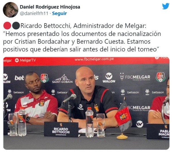 “Hemos presentado los documentos de nacionalización por Cristian Bordacahar y Bernardo Cuesta. Estamos positivos que deberían salir antes del inicio del torneo”, comentó el directivo Ricardo Bettocchi, administrador de FBC Melgar durante conferencia de prensa.