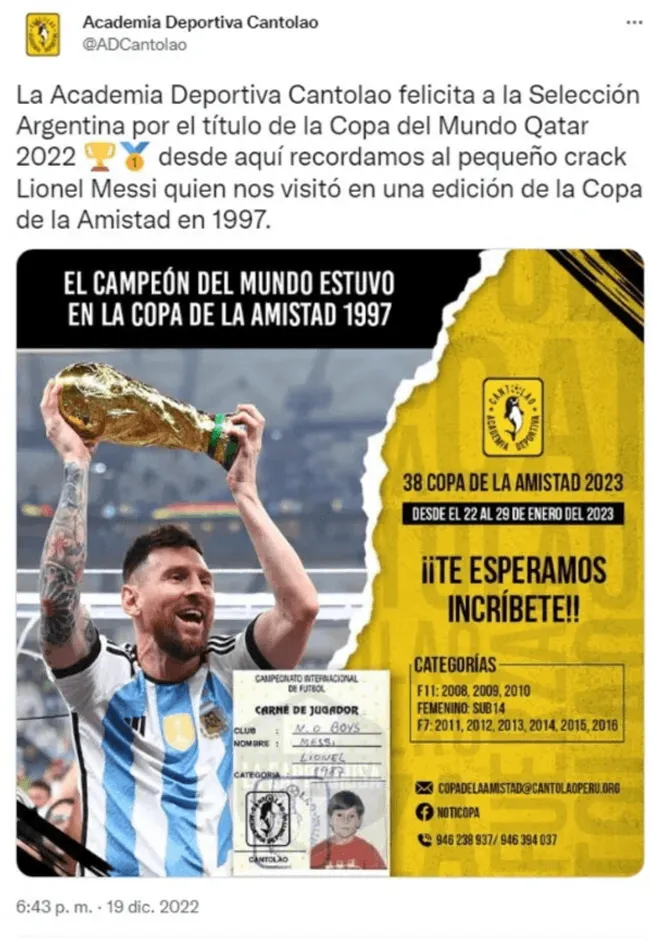 “La Academia Deportiva Cantolao felicita a la Selección Argentina por el título de la Copa del Mundo Qatar 2022. Desde aquí recordamos al pequeño crack Lionel Messi, quien nos visitó en una edición de la Copa de la Amistad en 1997. 38 Copa de la Amistad 2023. Desde el 22 al 29 de enero. Te esperamos, inscríbete”, se aprecia en la publicación.