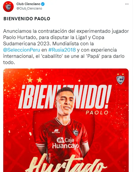 El volante fue anunciado por las redes sociales de los imperiales:” Anunciamos la contratación del experimentado jugador Paolo Hurtado, para disputar la Liga 1 y Copa Sudamericana 2023. Mundialista con la Selección Perú en Rusia 2018 y con experiencia internacional, el caballitose une al Papá para darlo todo”, comunicaron.