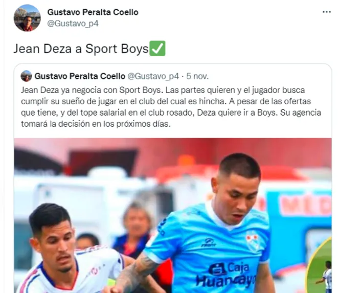 Además, se les recuerda parte del descenso de Alianza Lima en el año 2020, estos futbolistas que están cerca de ponerse la camiseta del Boys,son Jean Deza y Alexi Gómez. Es que, según Gustavo Peralta, periodista de Líbero, este par llegará la próxima temporada al puerto.