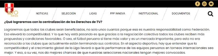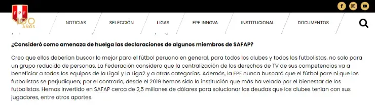 “Creo que ellos deberían buscar lo mejor para el fútbol peruano en general, para todos los clubes y todos los futbolistas, no solo para un grupo reducido de personas. La Federación considera que la centralización de los derechos de TV de sus competencias va a beneficiar a todos los equipos de la Liga 1 y la Liga2 y a otras categorías. Además, la FPF nunca buscará que el fútbol pare ni que los futbolistas se perjudiquen; por el contrario, desde el 2019 hemos sido la institución que más ha velado por el bienestar de los futbolistas. Hemos invertido en SAFAP cerca de 2,5 millones de dólares para solucionar las deudas que los clubes tenían con sus jugadores, entre otros aportes”, comunicó.