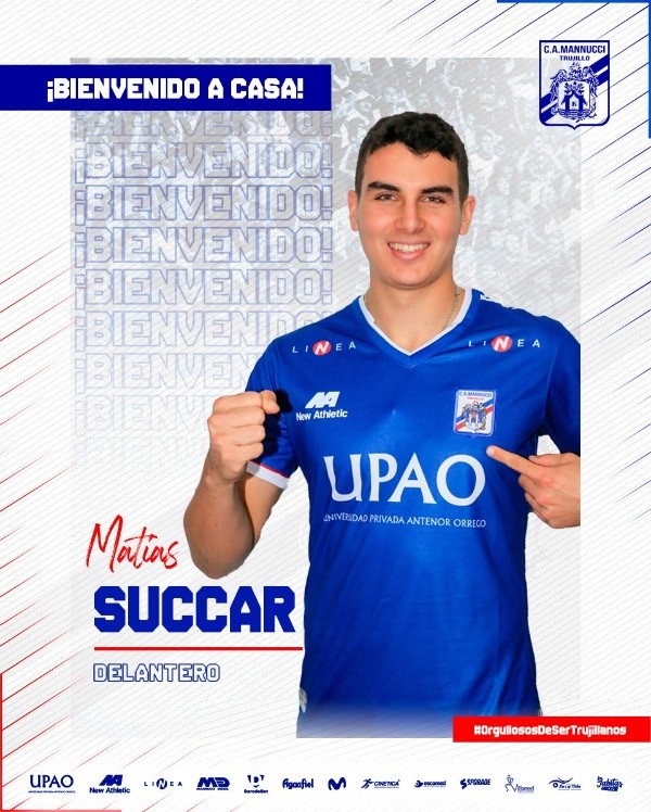 “¡Bienvenido a Trujillo, Matías! El joven de 23 años Matías Succar llega a la Tricolor para luchar por un puesto en la ofensiva del equipo y ganarse un lugar en el corazón de la hinchada. ¡A dejarlo todo, Succar!”, publicó el club en sus redes sociales.