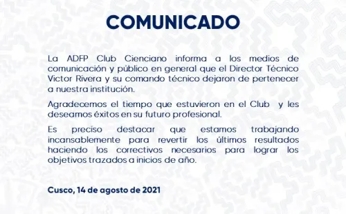 El pasado 14 de agosto el club Cienciano del Cusco emitió un comunicado de prensa donde informó el retiro del técnico Víctor Rivera junto a su comando técnico de la institución, donde se le agradeció los servicios prestados con el equipo y le desearon suerte el su futuro profesional en adelante.