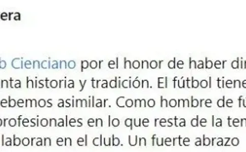 El técnico, mediante sus redes sociales, también brindó unas palabras al club tras la nota de prensa que emitió diciendo: “Agradezco al Club Cienciano por el honor de haber dirigido una institución con tanta historia y tradición. El fútbol tiene de estos momentos que debemos asimilar. Como hombre de fútbol, les deseo todos los éxitos profesionales en lo que resta de la temporada a todas las personas que laboran en el club. Un fuerte abrazo”, dijo el ‘chino’.