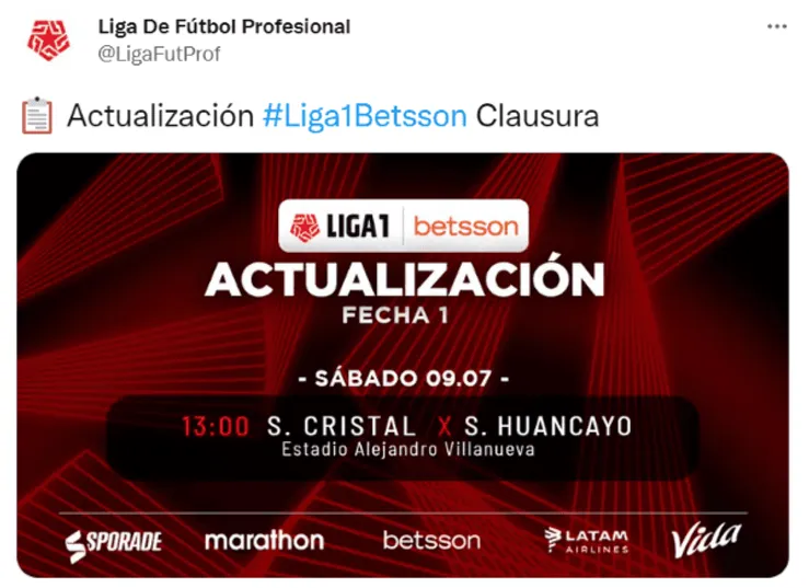 De acuerdo a la programación de la Liga 1,Sporting Cristal y Sport Huancayo jugarán este sábado 09 de julio, desde las13:00 p.m. (hora peruana). Este encuentro se desarrollará en el estadio Alejandro Villanueva de La Victoria.