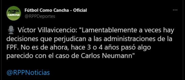 Atacando a un equipo que empezó a hacer reclamos externos a lo que se ve en cancha, señala: “Lamentablemente a veces hay decisiones que perjudican a las administraciones de la FPF. No es de ahora, hace 3 o 4 años pasó algo parecido con el caso de Carlos Neumann”. Claramente, se refiere a Alianza Lima, club que reclamó en mesa esa temporada contra Real Garcilaso.