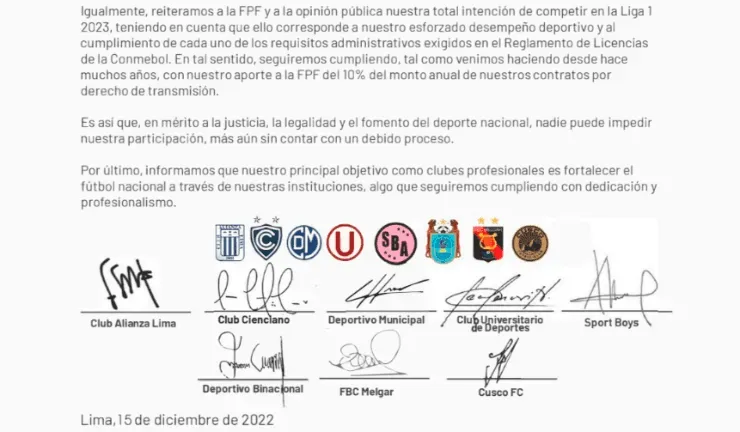“Reiteramos a la FPF y a la opinión pública nuestra total intención de competir en la Liga 1 2023, teniendo en cuenta que ello corresponde a nuestro esforzado desempeño deportivo y al cumplimiento de cada uno de los requisitos administrativos exigidos por el Reglamento de Licencias de la Conmebol”.