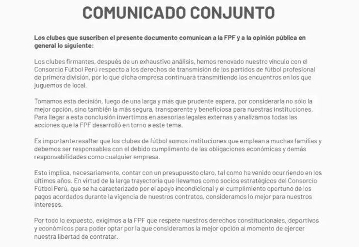 En un comunicado en conjunto: Alianza Lima, Universitario, Cienciano, Municipal, Sport Boys, Deportivo Binacional, Mannucci y Cusco FC renovaron su vinculación con el Consorcio Fútbol Perú con respecto a los derechos de transmisión e hicieron un pedido a la Federación Peruana de Fútbol.