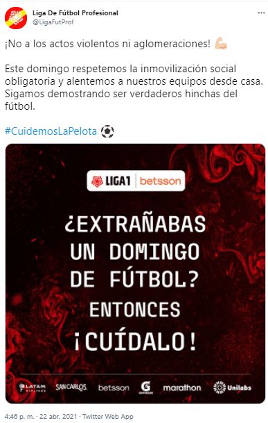 Después de ello, exhortó a que las barras principales de los tres equipos más grandes del Perú se comporten bien: “¡No a los actos violentos ni aglomeraciones! Este domingo respetemos la inmovilización social obligatoria y alentemos a nuestros equipos desde casa. Sigamos demostrando ser verdaderos hinchas del fútbol”.