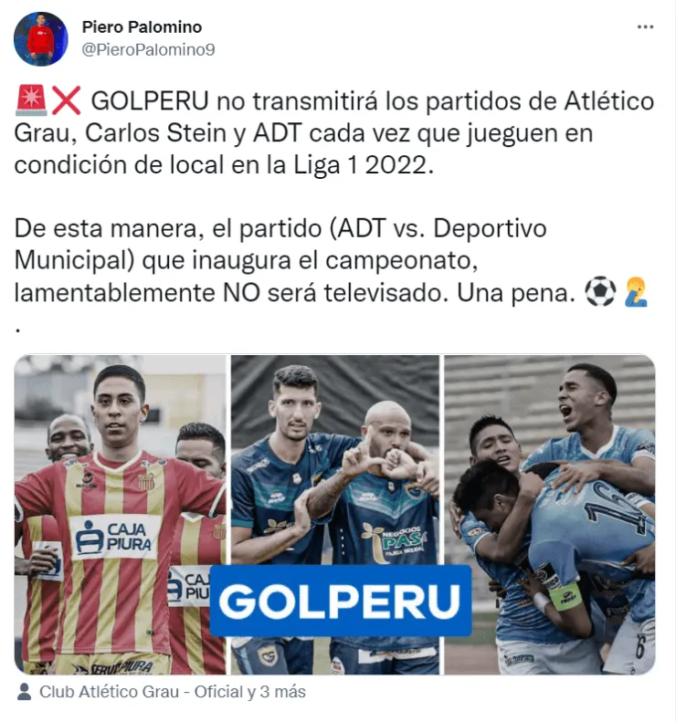 “GOLPERU no transmitirá los partidos de Atlético Grau, Carlos Stein y ADT cada vez que jueguen en condición de local en la Liga 1 2022. De esta manera, el partido (ADT vs. Deportivo Municipal) que inaugura el campeonato, lamentablemente NO será televisado. ¡Una pena!”, aseguró el periodistaPiero Palomino.