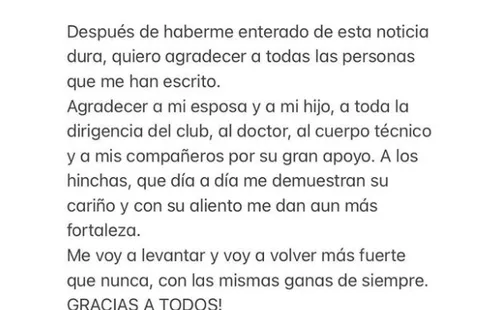 “Después de haberme enterado de esta noticia dura, quiero agradecer a todas las personas que me han escrito.Agradecer a mi esposa y a mi hijo, a toda la dirigencia del club, al doctor, al cuerpo técnico y a mis compañeros por su gran apoyo”, dice el mensaje publicado por el atacante ‘charrúa’ en sus redes sociales.