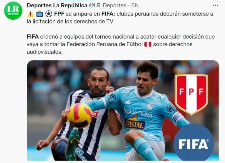 En las últimas semanas se ha especulado muchoel hecho de que la Liga 1 dejará de ser transmitida por Gol Perú y susderechos de transmisión pasarían a otra cadena televisiva, por lo que se generó cierto disgusto al canal de TV. Bajo ese contexto, la FIFAdio a conocer su posicióny ordenó a los clubes peruanos que acepten la decisión de la Federación Peruana de Fútbol (FPF).